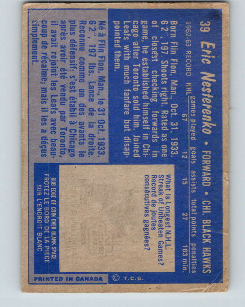 1963-64 Topps #39 Eric Nesterenko Chicago Blackhawks V422