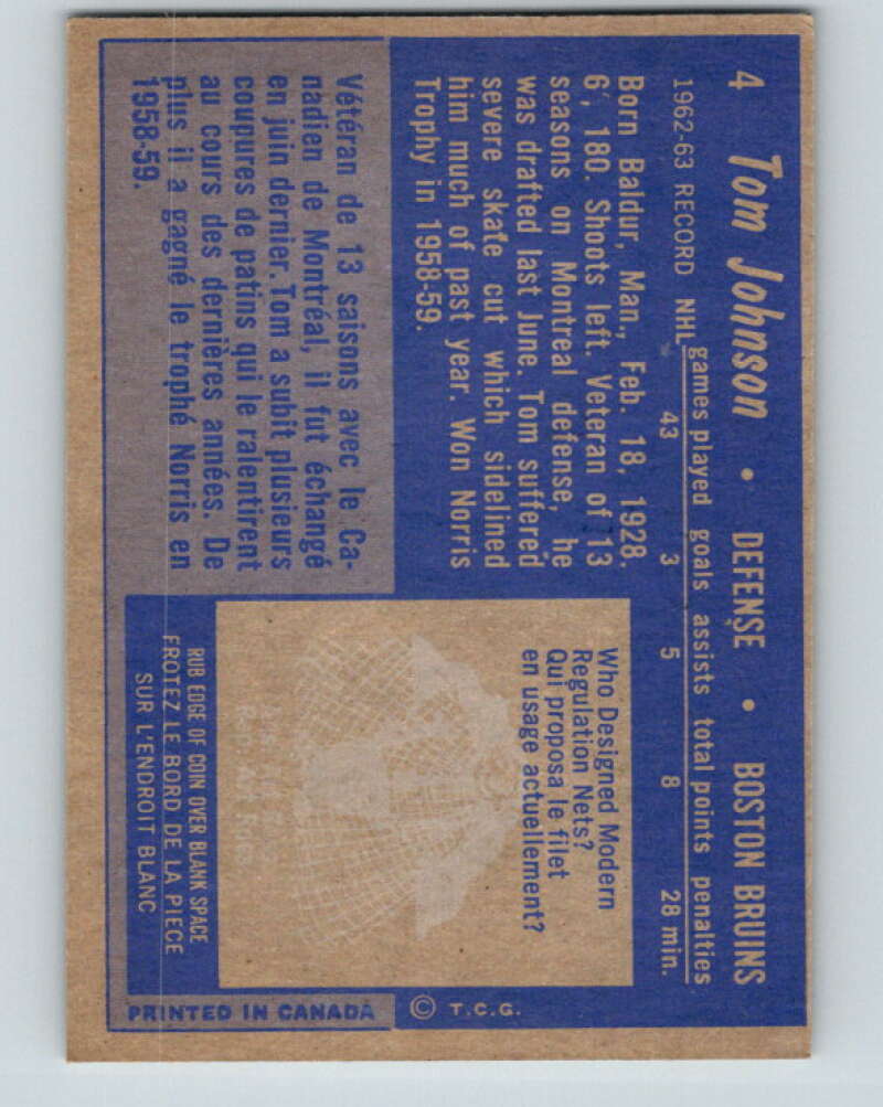 1963-64 Topps #4 Tom Johnson Boston Bruins V377