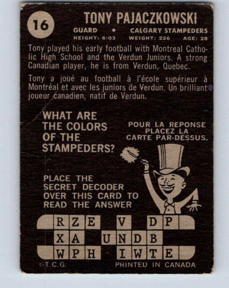 1964 Topps CFL Football #16 Tony Pajaczkowski, Calgary Stampeders V32756