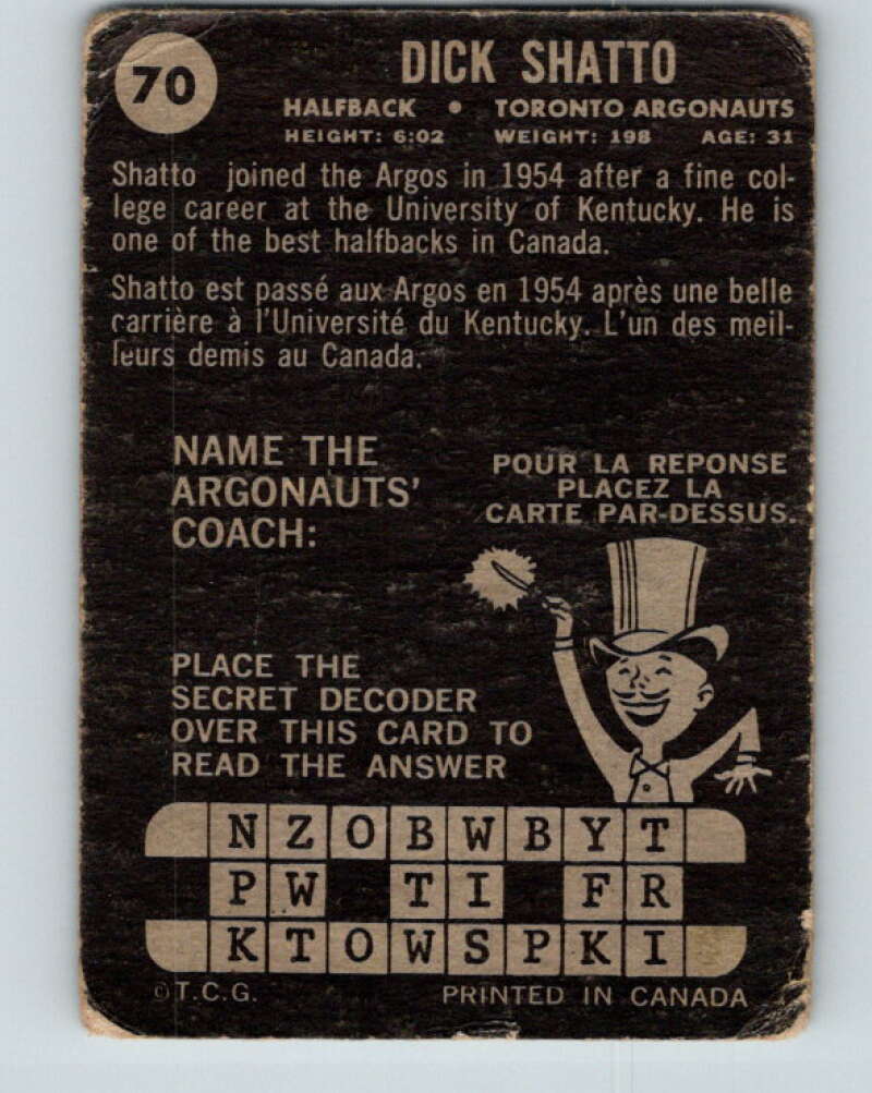 1964 Topps CFL Football #70 Dick Shatto, Toronto Argonauts V32774