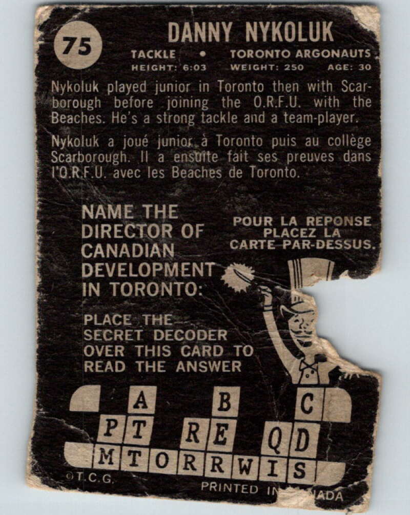 1964 Topps CFL Football #75 Danny Nykoluk, Toronto Argonauts V32780