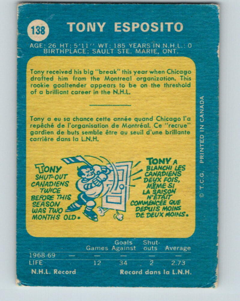 1969-70 O-Pee-Chee #138 Tony Esposito RC Rookie Chicago Blackhawks V2017