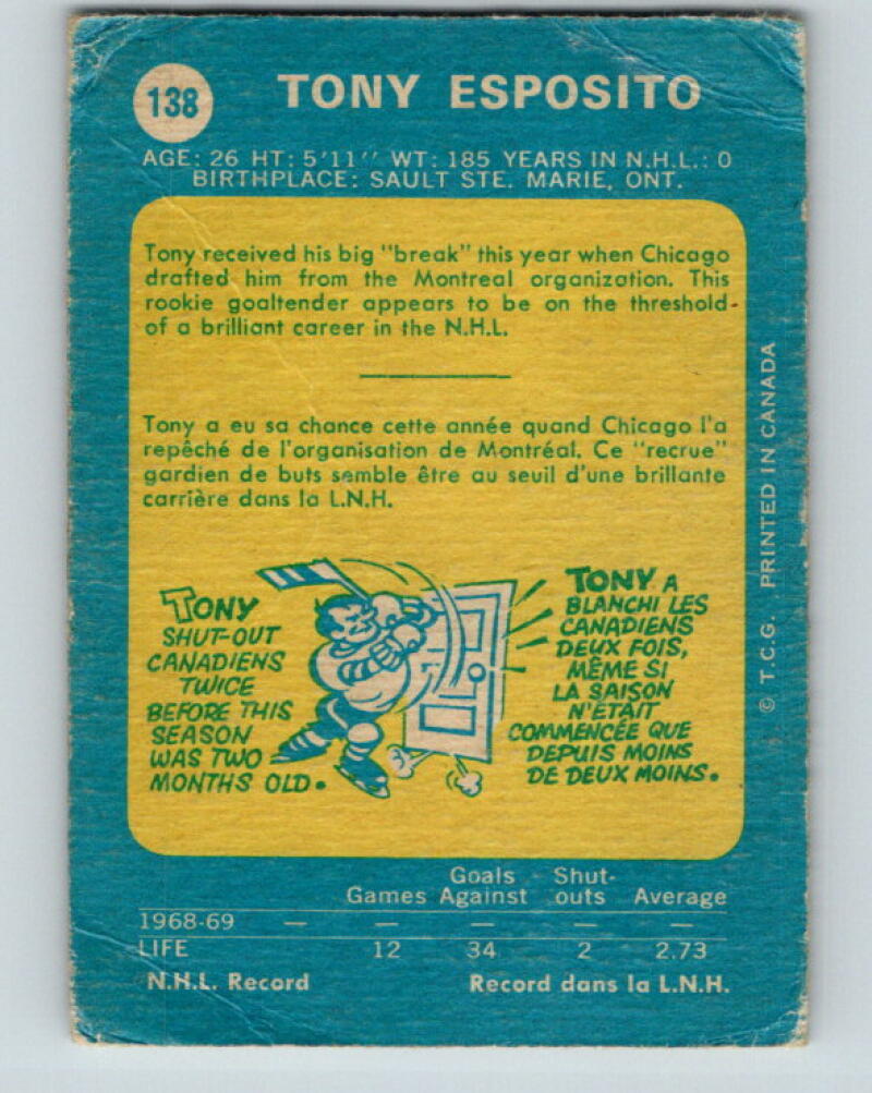 1969-70 O-Pee-Chee #138 Tony Esposito RC Rookie Chicago Blackhawks V2018