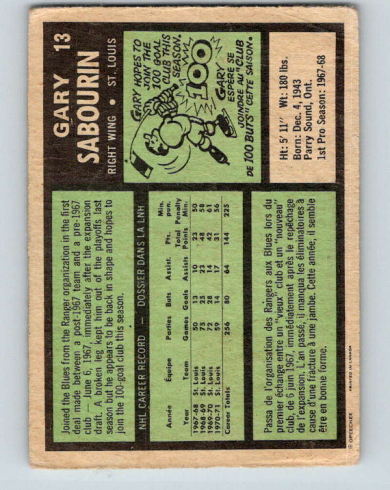 1971-72 O-Pee-Chee #13 Gary Sabourin St. Louis Blues V9013