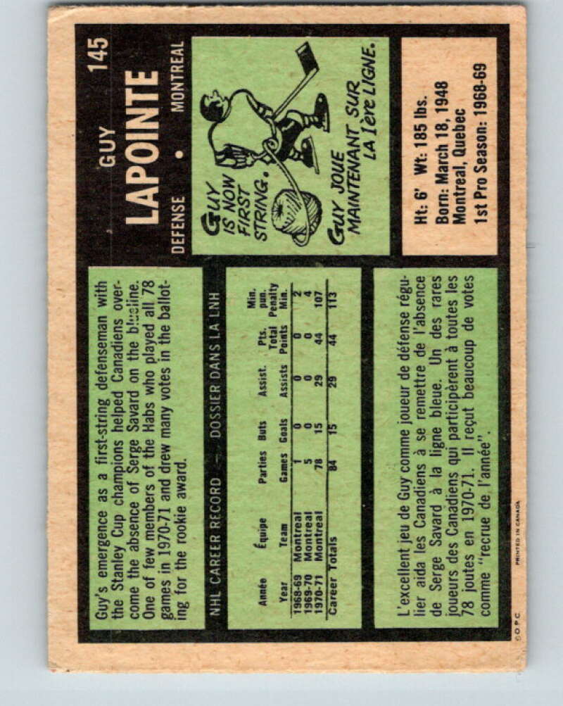 1971-72 O-Pee-Chee #145 Guy Lapointe Montreal Canadiens V9368