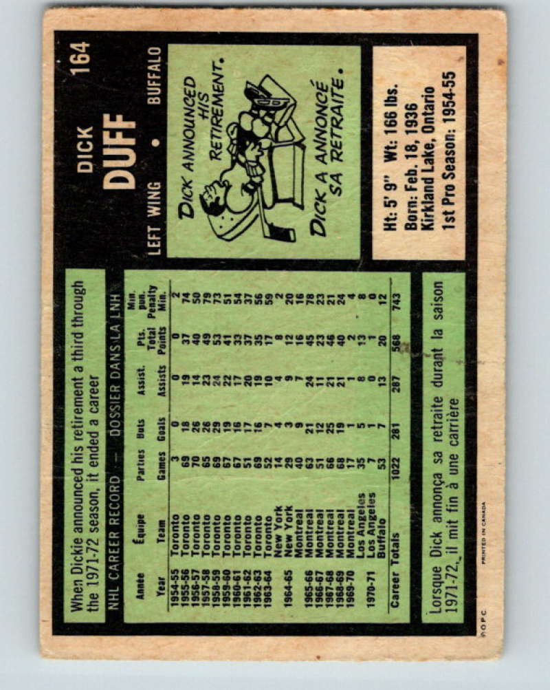 1971-72 O-Pee-Chee #164 Dick Duff Buffalo Sabres 8859