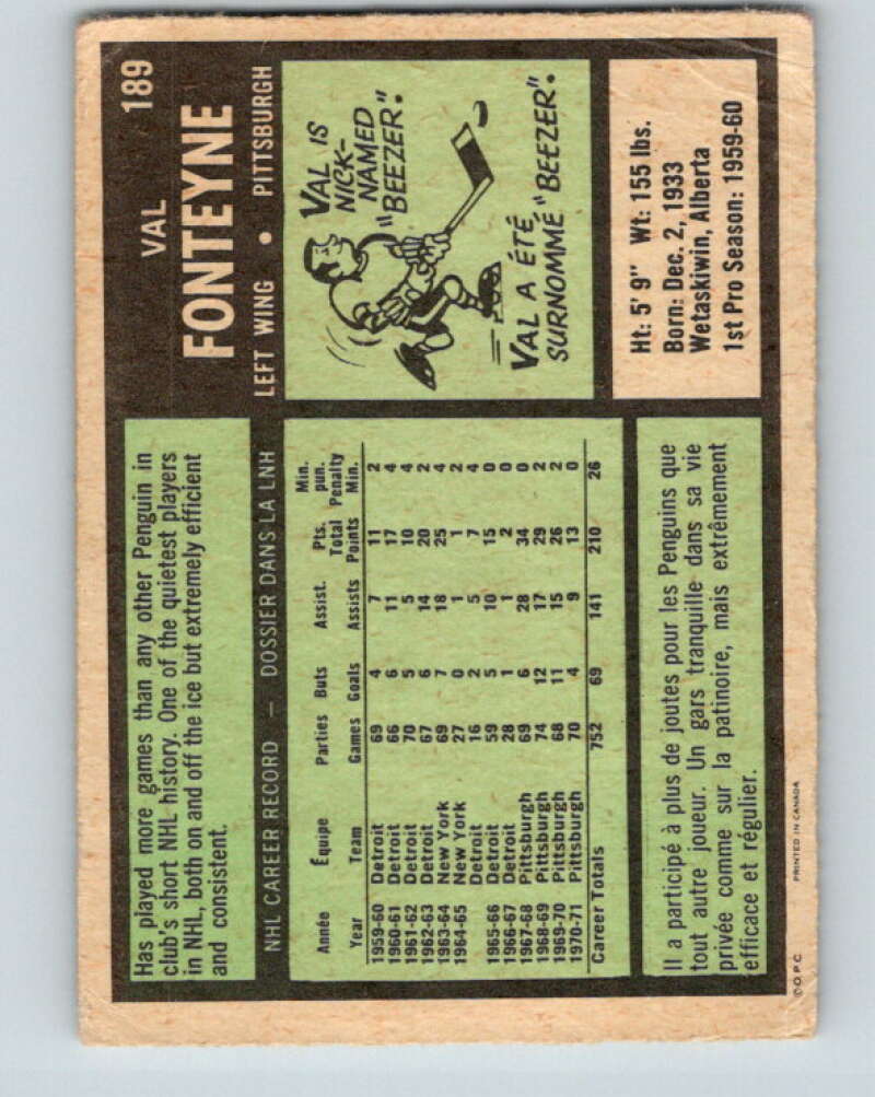 1971-72 O-Pee-Chee #189 Val Fonteyne Pittsburgh Penguins V9559