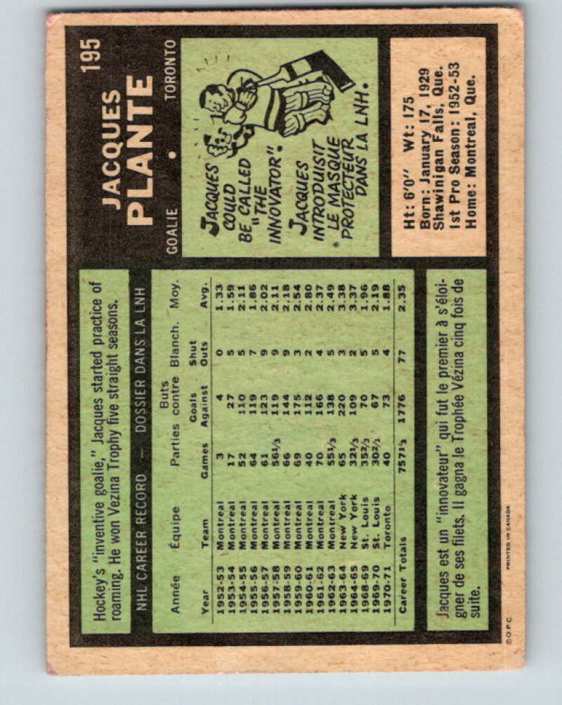 1971-72 O-Pee-Chee #195 Jacques Plante Toronto Maple Leafs V9585