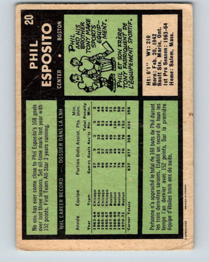 1971-72 O-Pee-Chee #20 Phil Esposito Boston Bruins V9030