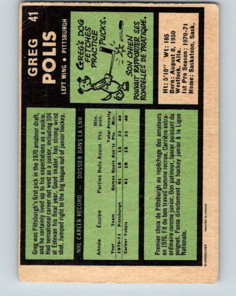 1971-72 O-Pee-Chee #41 Greg Polis RC Rookie Pittsburgh Penguins V9091