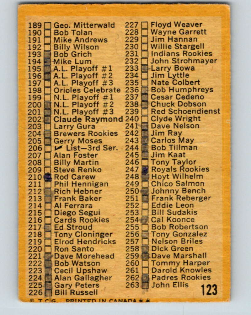 1971 O-Pee-Chee MLB #123 Checklist 133-263 � V10870