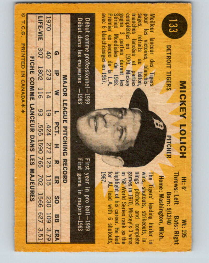1971 O-Pee-Chee MLB #133 Mickey Lolich� Detroit Tigers� V10886