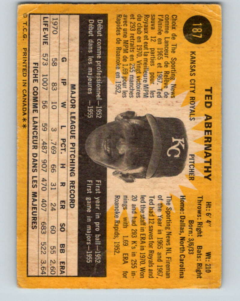1971 O-Pee-Chee MLB #187 Ted Abernathy� Kansas City Royals� V10994