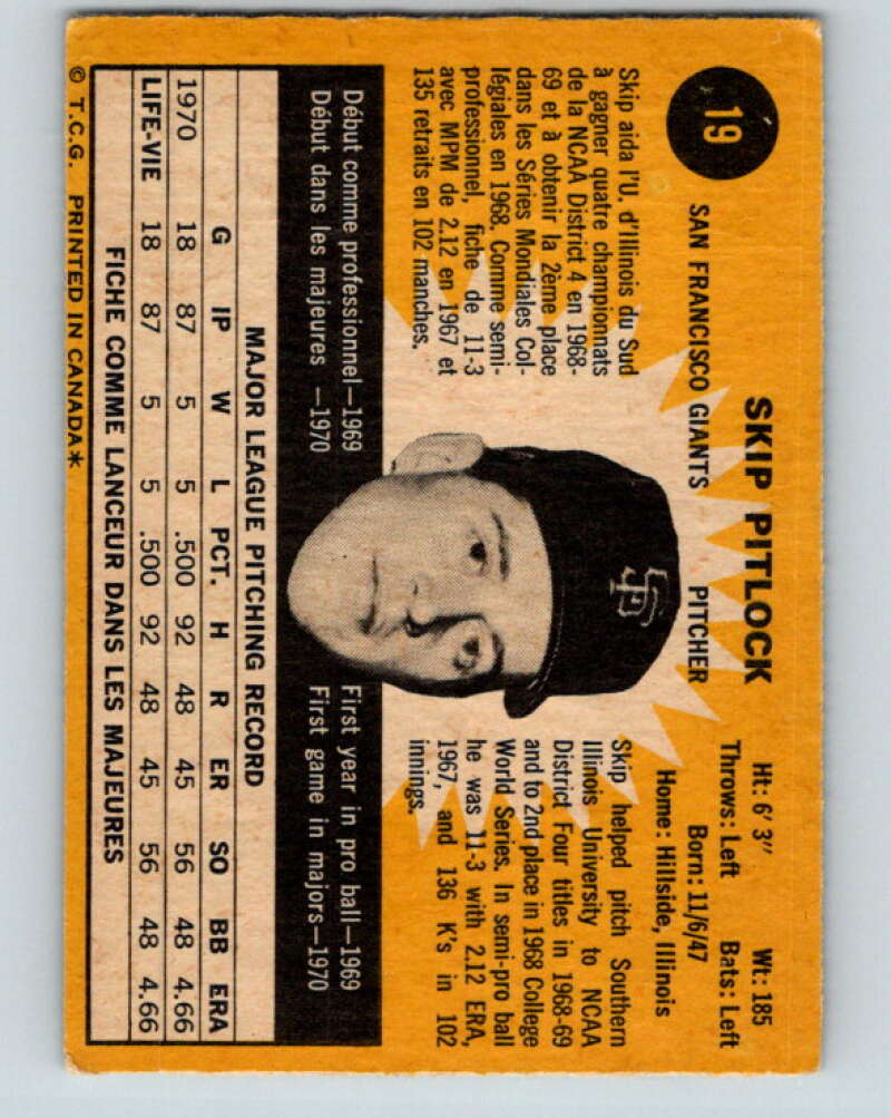 1971 O-Pee-Chee MLB #19 Skip Pitlock� RC Rookie Giants� V10703