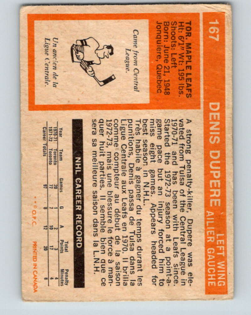 1972-73 O-Pee-Chee #167 Denis Dupere Toronto Maple Leafs V3984