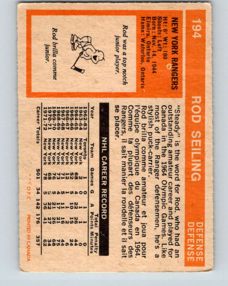 1972-73 O-Pee-Chee #194 Rod Seiling New York Rangers V4086