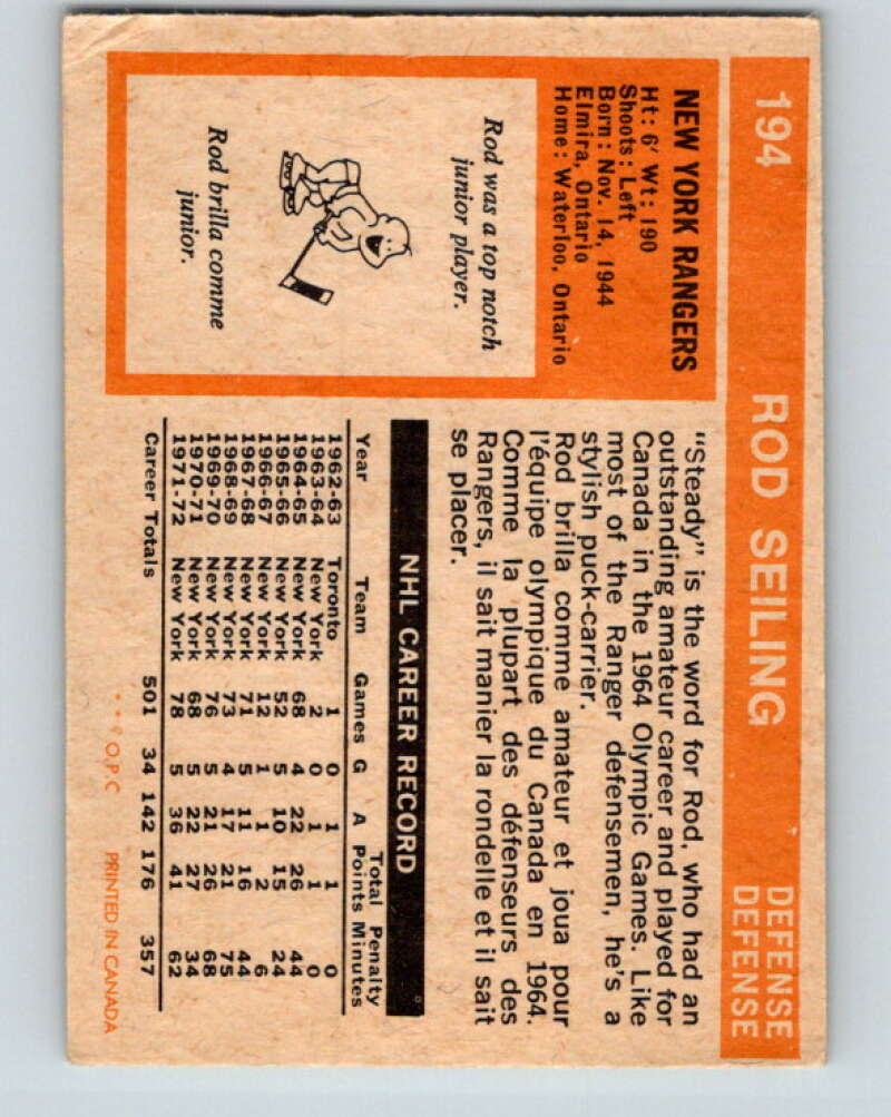 1972-73 O-Pee-Chee #194 Rod Seiling New York Rangers V4089