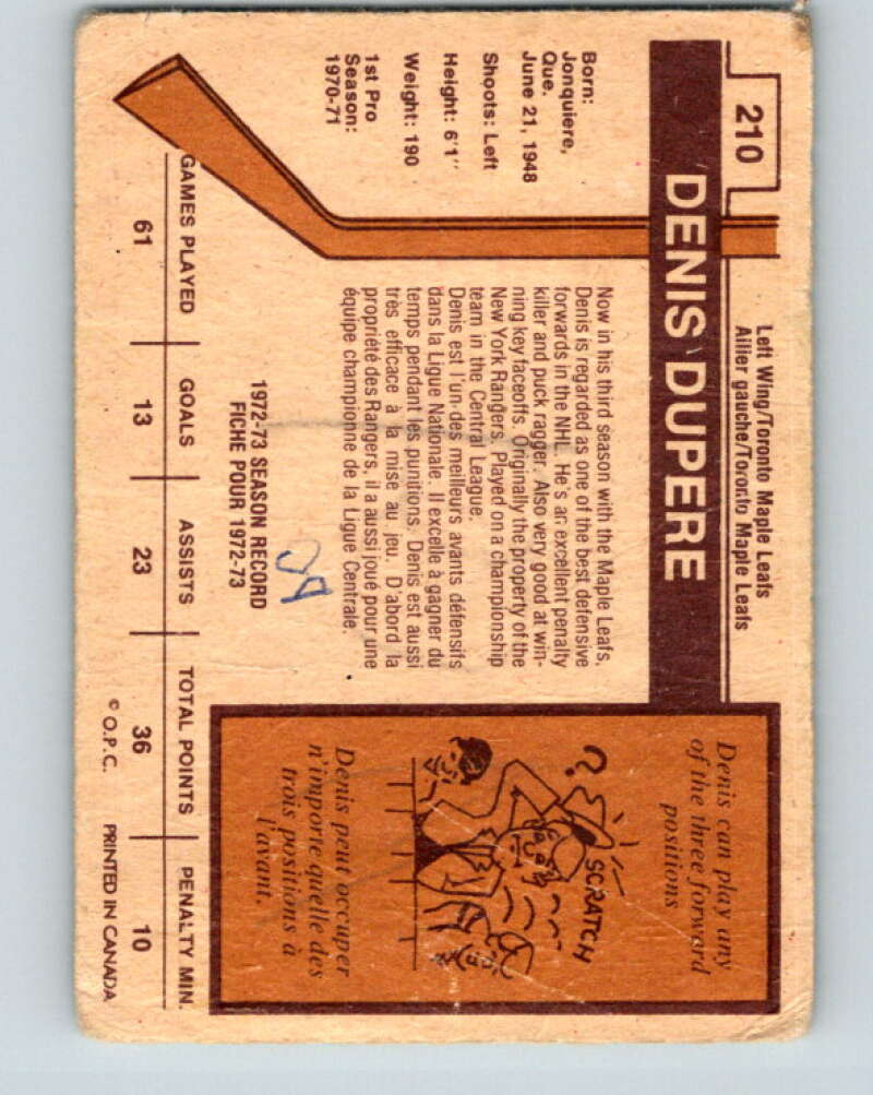 1973-74 O-Pee-Chee #210 Denis Dupere Toronto Maple Leafs V8563
