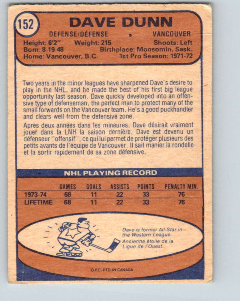 1974-75 O-Pee-Chee #152 Dave Dunn RC Rookie Vancouver Canucks V4568