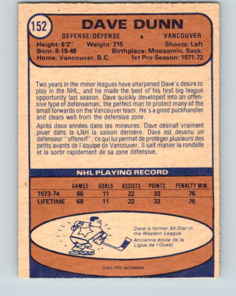 1974-75 O-Pee-Chee #152 Dave Dunn RC Rookie Vancouver Canucks V4571