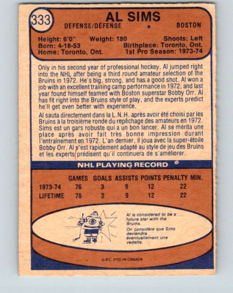 1974-75 O-Pee-Chee #333 Al Sims RC Rookie Boston Bruins V5010