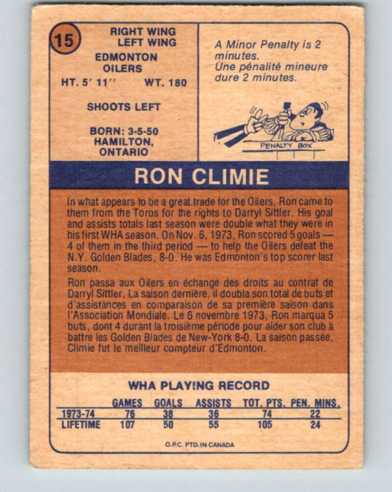 1974-75 WHA O-Pee-Chee #15 Ron Climie Edmonton Oilers V7043