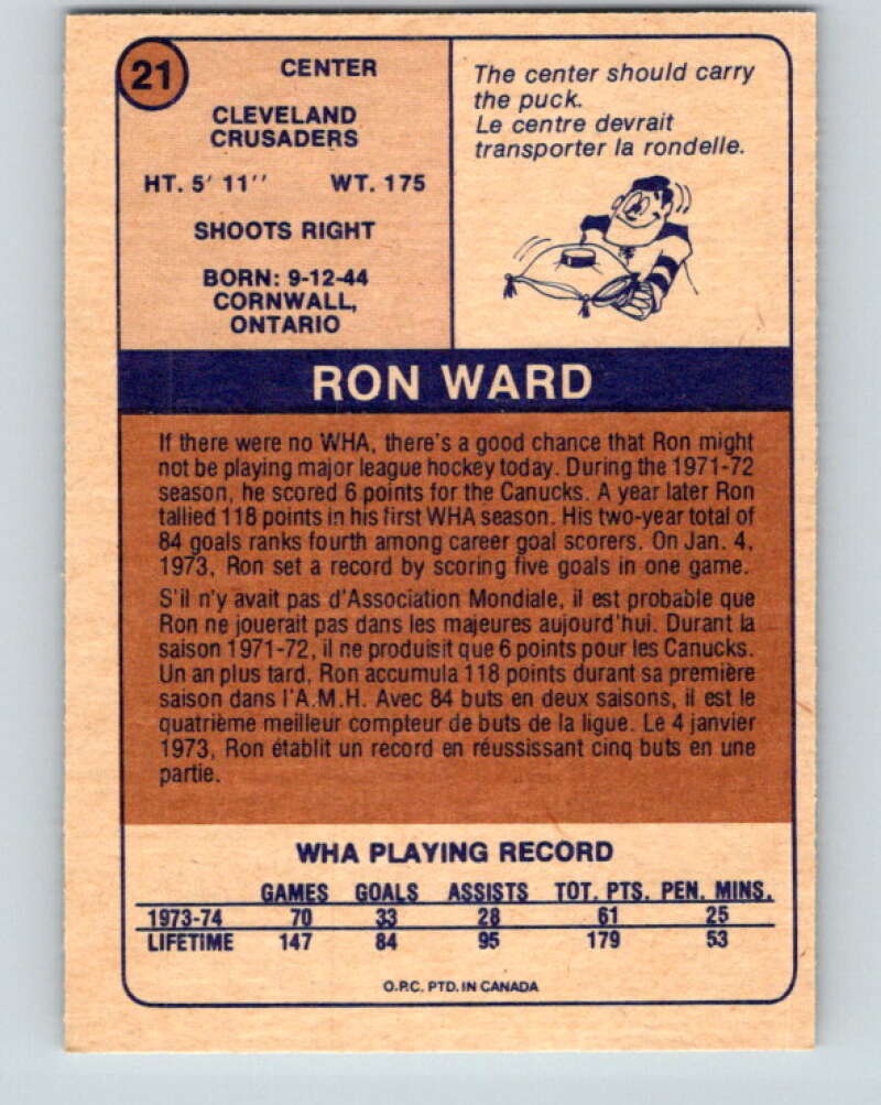 1974-75 WHA O-Pee-Chee #21 Ron Ward Cleveland Crusaders V7062