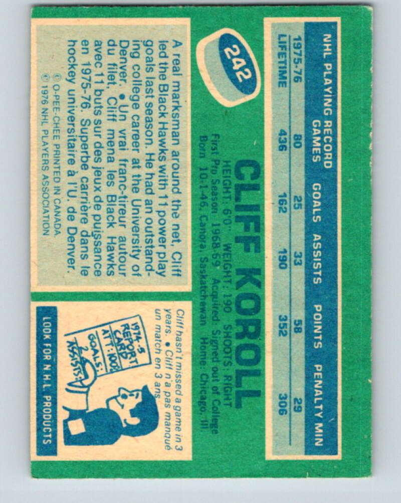 1976-77 O-Pee-Chee #242 Cliff Koroll Chicago Blackhawks V12391