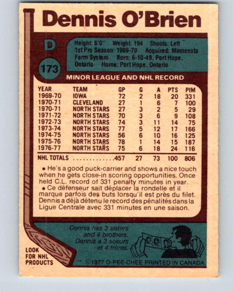 1977-78 O-Pee-Chee #173 Dennis O'Brien Minnesota North Stars V14144