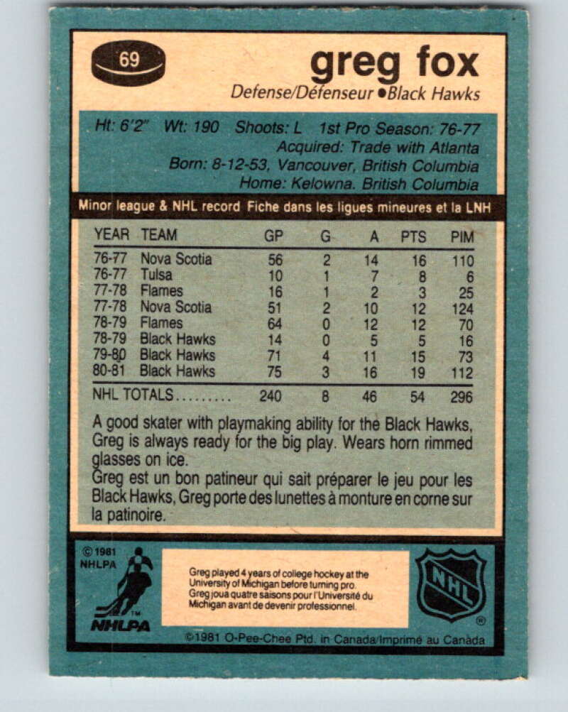 1981-82 O-Pee-Chee #69 Greg Fox Chicago Blackhawks V29901