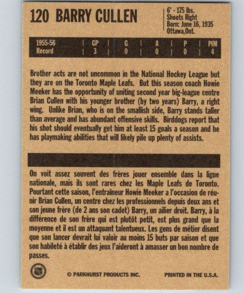1994-95 Parkhurst Missing Link #120 Barry Cullen Maple Leafs NHL Hockey