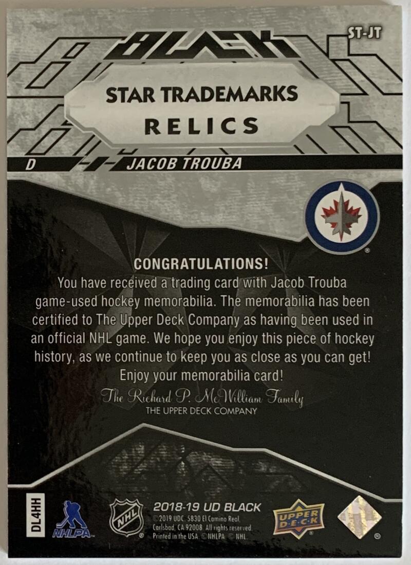 2018-19 UD Black Star Trademarks Relics #STJT Jacob Trouba 75/199 Jersey 08210